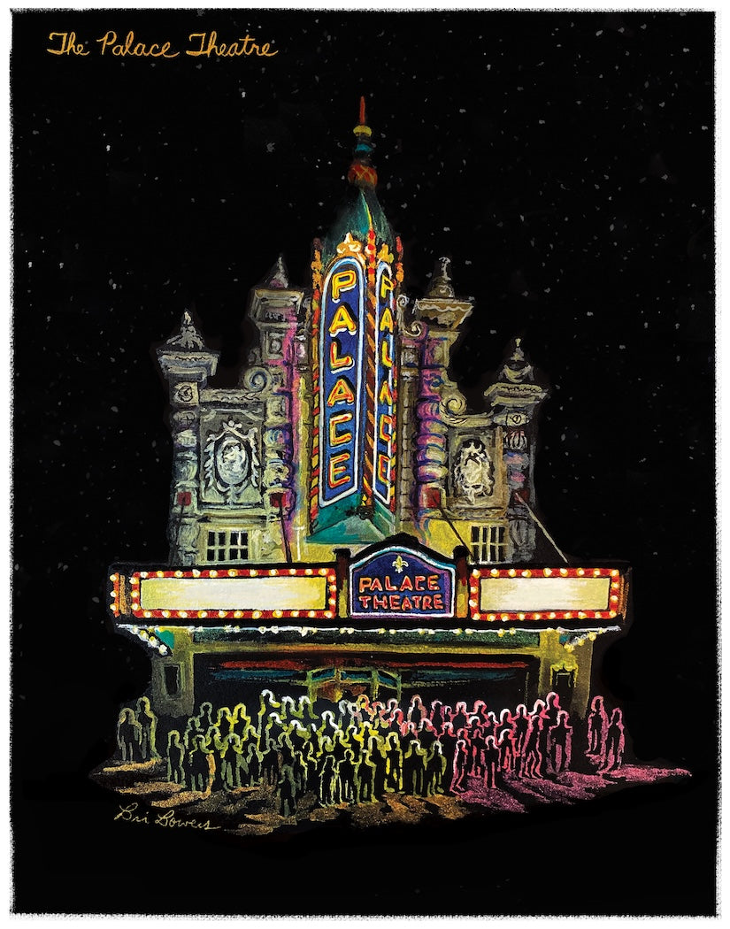 Louisville Palace Theatre at night watercolor illustration. Available in 8.5" x 11", 11" x 14", and 11" x 14" with personalized marquee.